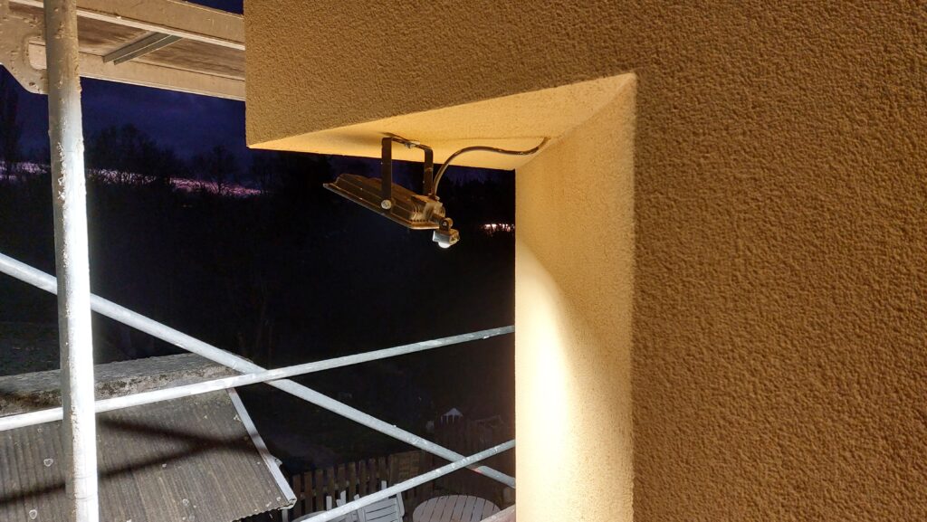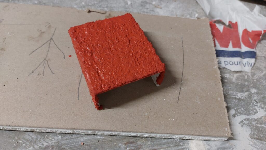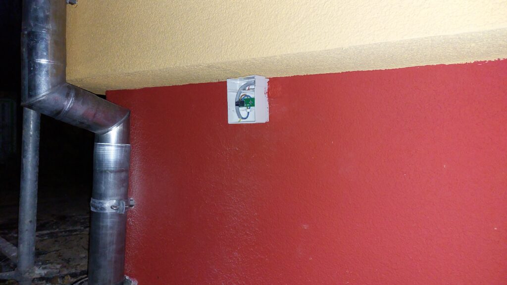 Mise en place de la sonde de température extérieure de la chaudière. Crépi de la boîte pour qu’elle soit plus discrète.