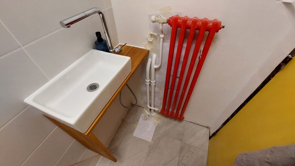 Deuxième couche de peinture glycéro sur les tubes des WC