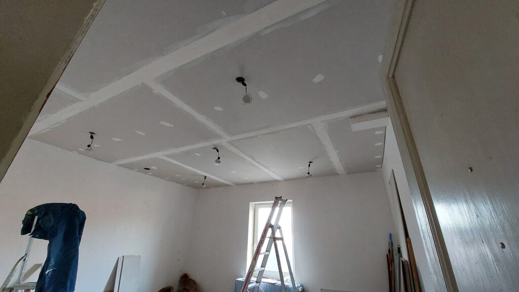 Première couche d’enduit sur les bandes du plafond.