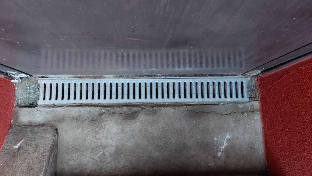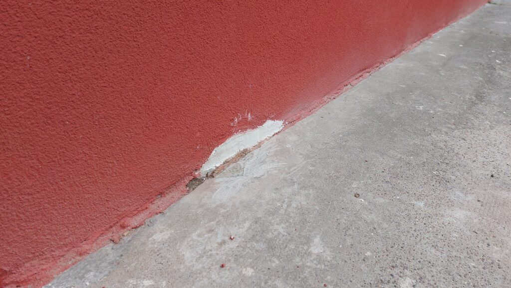 Travaux extérieur, remplissage d’un morceau de mur avec la sous-couche colle, mise en place d’une rigole d’eau au niveau de l’entrée de la cave