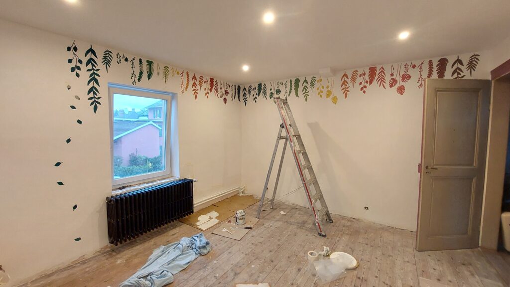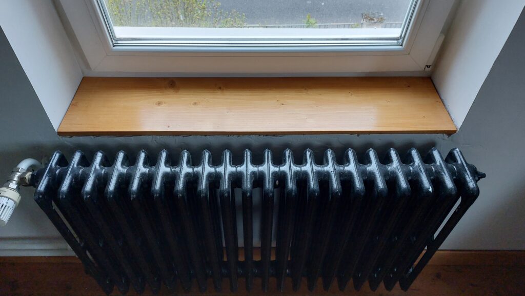 Quelques retouches dans la chambre Ouest et mise en peinture des tuyaux de radiateur