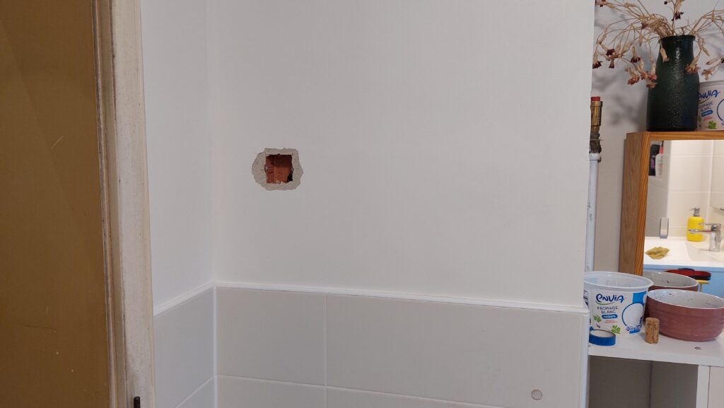 Installation d’une boîte électrique pour mettre un commande afin de piloter la VMC depuis la salle de bain. Casse du mur pour mettre en place la boîte, passage de gain directement dans le conduit de cheminée montant vers le grenier. Plâtre pour sceller l’ensemble.