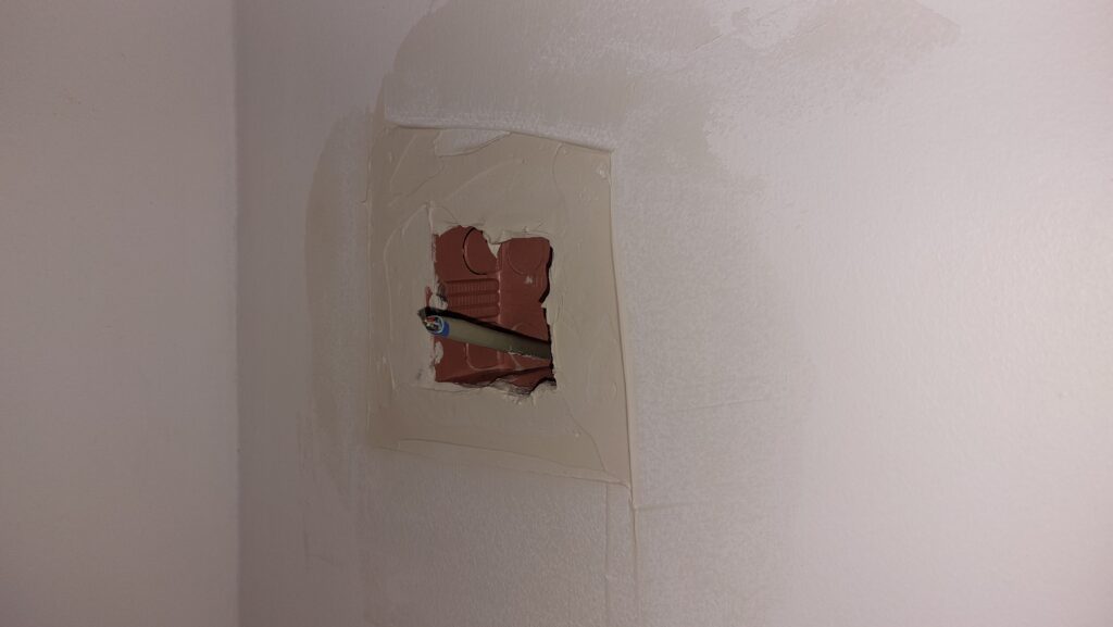 Application d’un enduit autour de la prise de la salle de bain pour le pilotage de la ventilation. Passage du câble de pilotage jusqu’à la ventilation et dénudage propre des fils