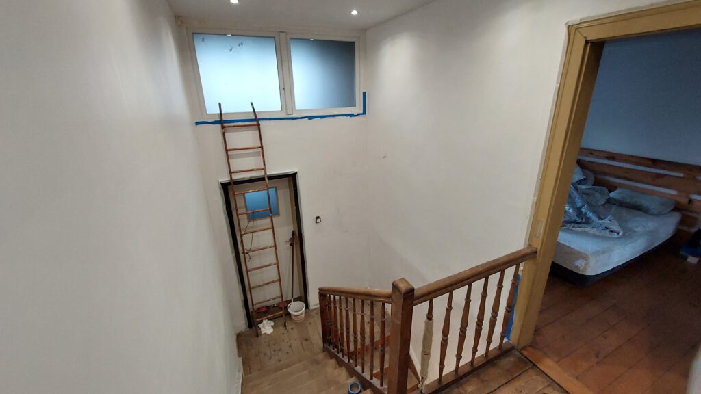Sous-couche de peinture dans l’escalier et quelques retouchez d’enduit.