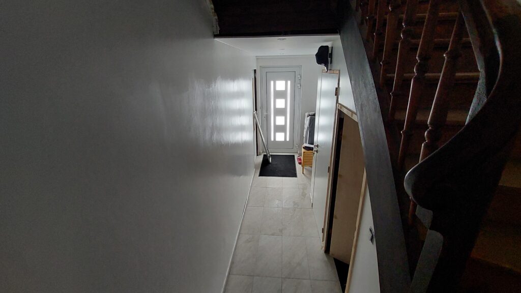 nettoyage de la fenêtre de l’escalier et ménage dans le sas au dessus. Accrochage de cadres dans le couloir.