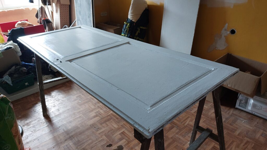 Mise en peinture de la porte de la chambre parentale. 2 couches. 2 ème couche de peinture sur la trappe du grenier.