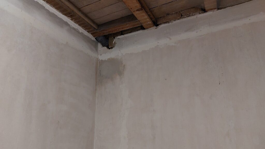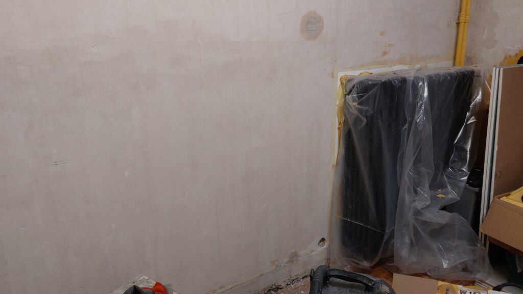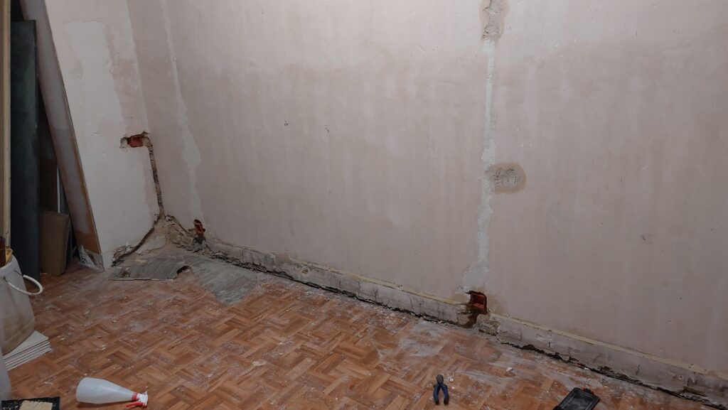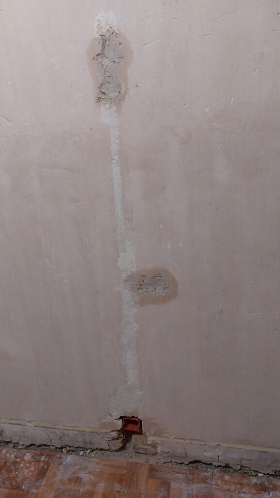 plâtre dans la plupart des trous et récupération des anciennes rainures pour les gaines électriques. Agrandissement des trois pour passer les boîtes électriques