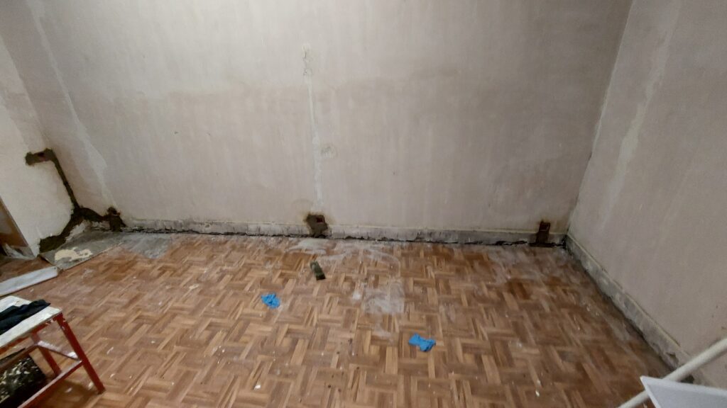 Mise en place des dernières boites de prises et bouchage au béton des saignée faites avant ou des saignées comportant une gaine, dans la chambre du RDC