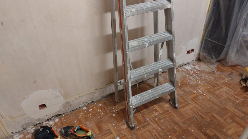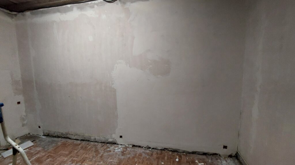 Démarrage de l’enduit dans la pièce du RDC. Enduit autour des prises et démarrage sur le mur Ouest par le Nord.