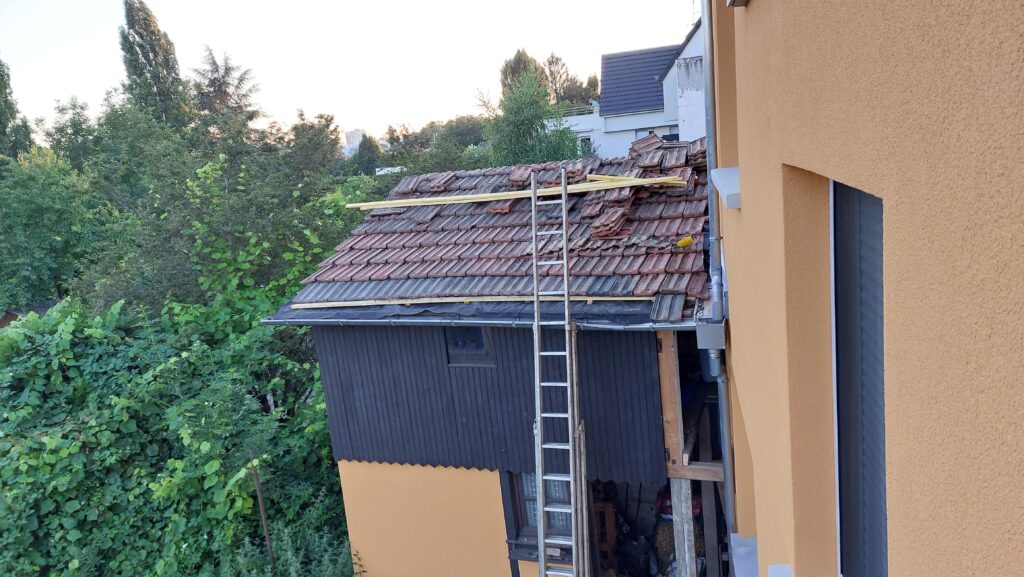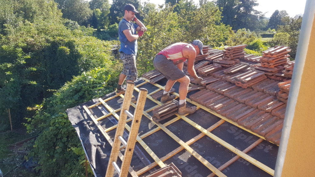 Retrait des tuiles sur le côté sud, installation de l’écran sous toiture, mise en place des lattes de toiture, remise en place des tuiles