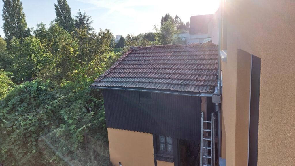 Retrait des tuiles, mises en place de l’écran sous toiture, lattage et remise en place des tuiles. Des découpes de tuiles.