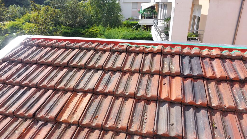 Mise en place de crépi sur le toit de la remise, entre les tuiles faitières et la pièce de zinc