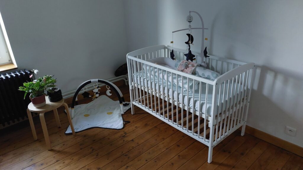 Aménagement de la chambre, montage du tapis d’éveil, du réhausseur de lit et de mobile