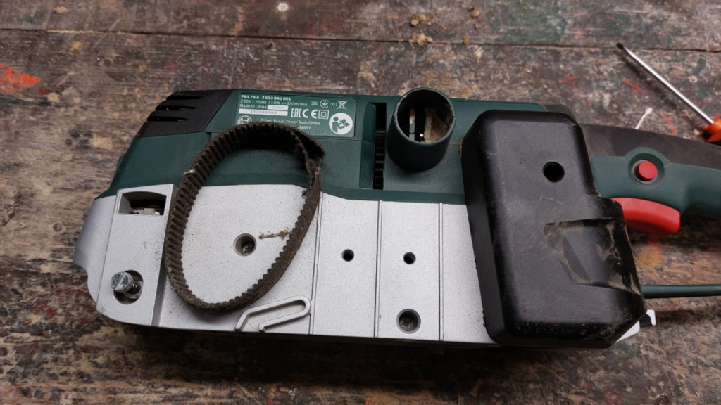 Démontage de la ponceuse pour comprendre le problème. La courroie est foutue. Commande d’un nouveau jeu de 2 courroies de remplacement le jour même