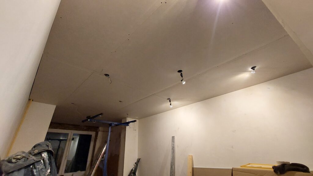 Mise en place des 2 dernières plaques de placo au plafond. Tout juste le bon compte pour finir. Un peu de plâtre pour remplir quelques trous du côté sud. Mise en place des derniers trous de spot.