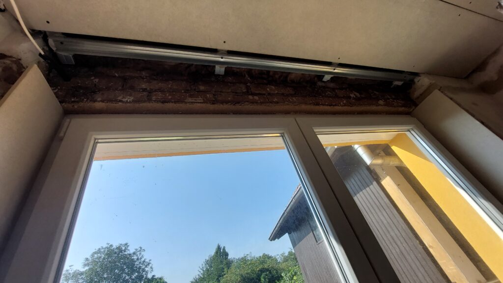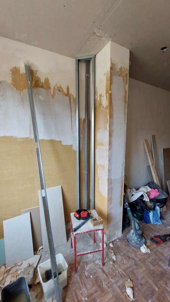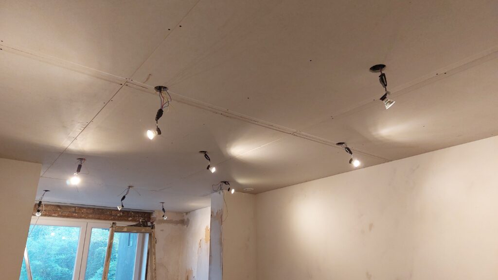 Installation du rail de placo pour le caisson au-dessus de la fenêtre. Découpe des plaques de placo de tour de fenêtre. Installation des rails pour cacher le conduit d’évacuation de douche. Course chez LM. Installation des lampes de manière temporaire. Remplissage des trous de plaques de plafond avec de la mousse expensive.