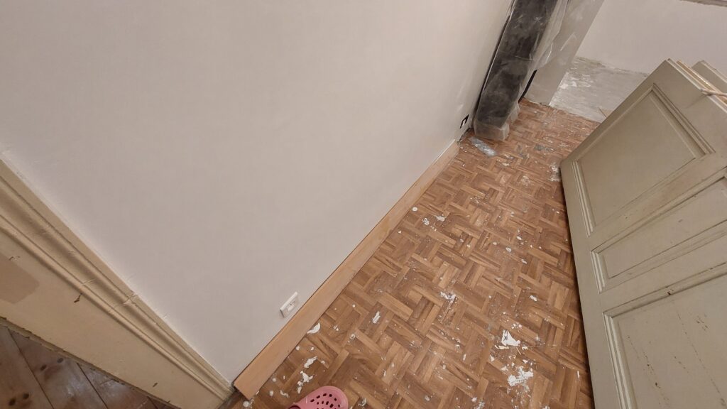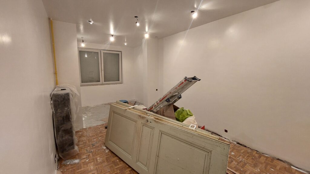 Petit coup de pouçage sur les quelques irrégularités. Coup de peinture par dessus. Remise en peinture dans angles et des quelques imperfection du plafond