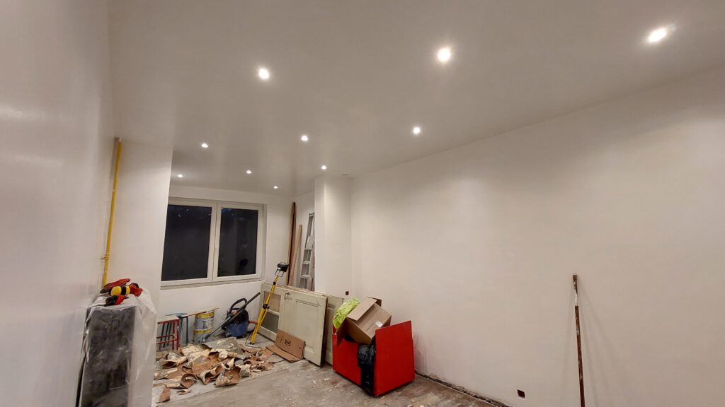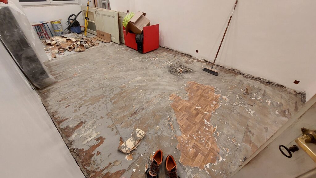 • Début de grattage du sol de la pièce du RDC et retrait de bouts du balatum