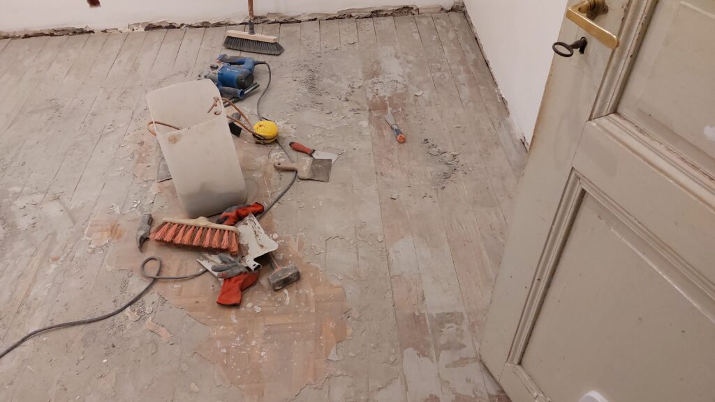 Grattage du sol de la pièce du RDC. 1j peu d’avancée.