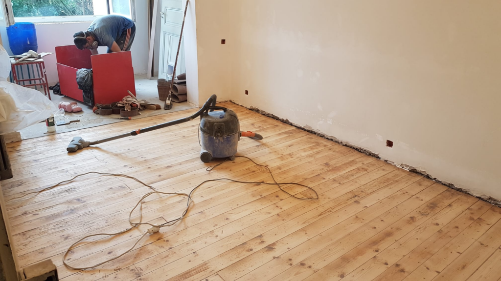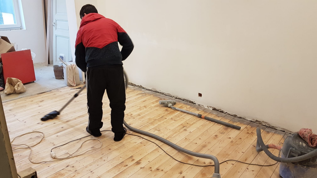 Finalisation du ponçage des coins avec la ponceuse d’angle, coup de ménage, rangement et application de la première couche de vitrificateur