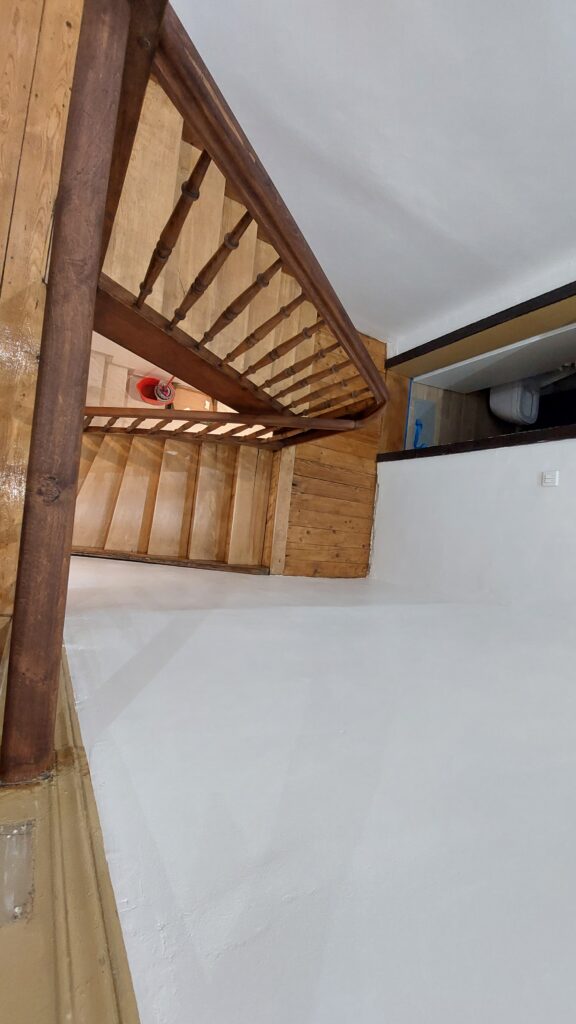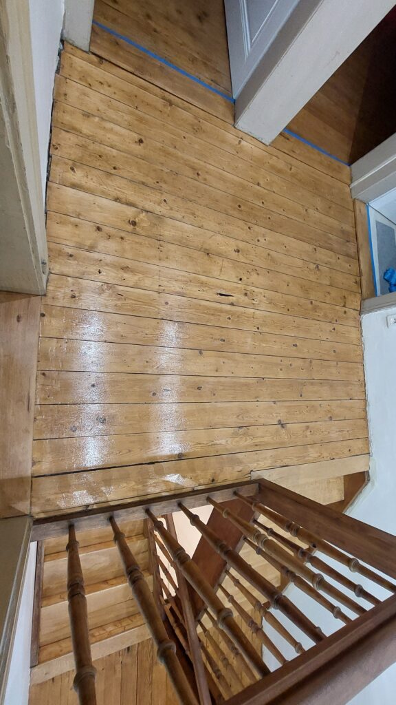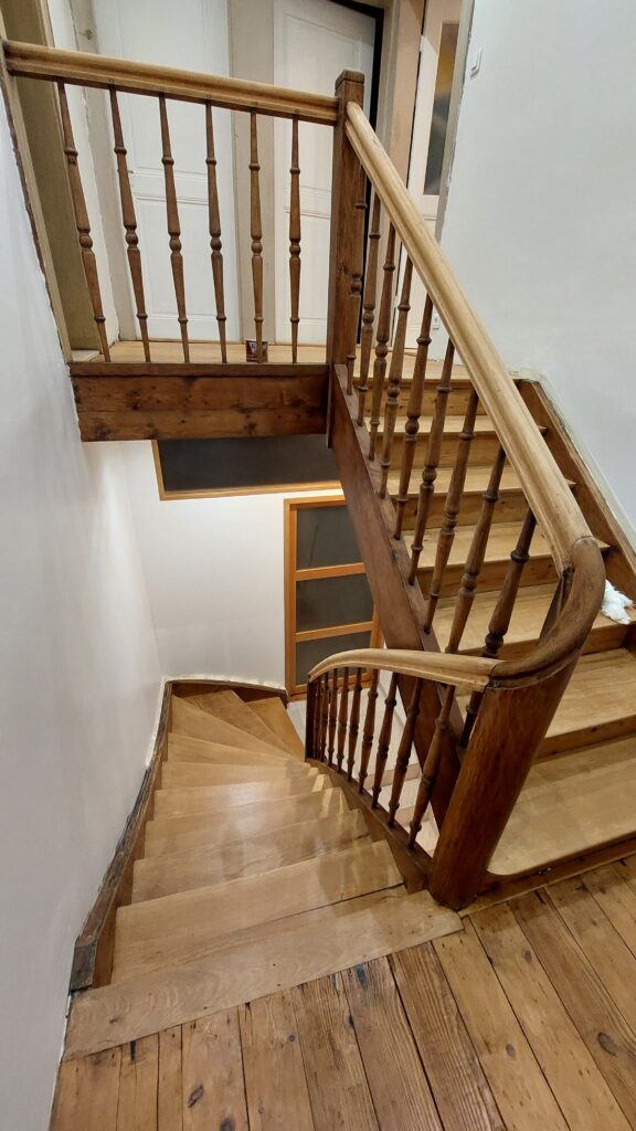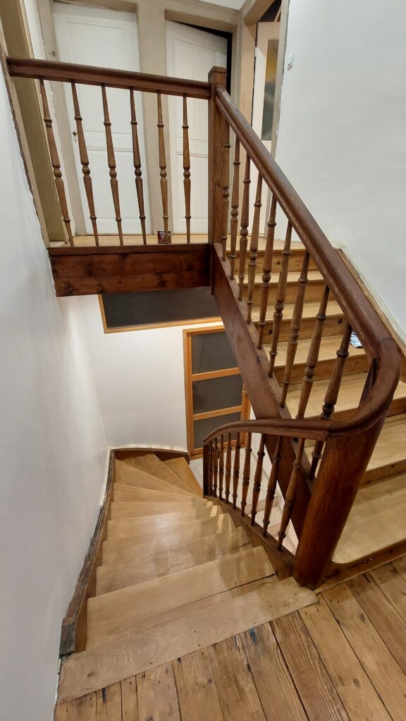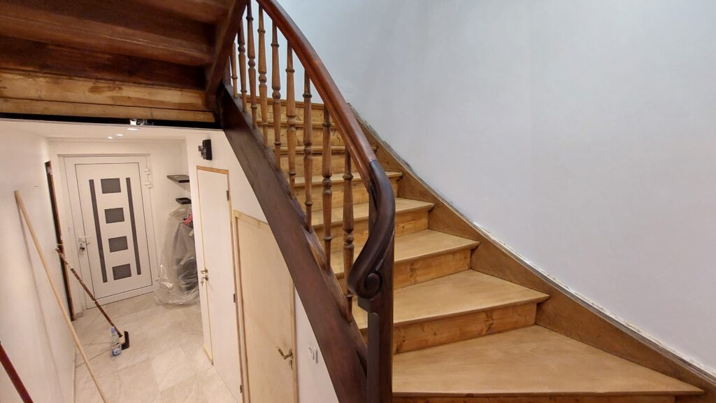 Mise en place d’une nouvelle couche de vitrificateur incolore satin sur les marches, contre marches, limons extérieurs et paliers