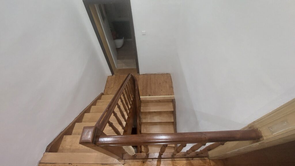 Dernière couche de vitrificateur incolore mat sur le palier de la salle de bain et une couche de vitrificateur satin sur la rambarde