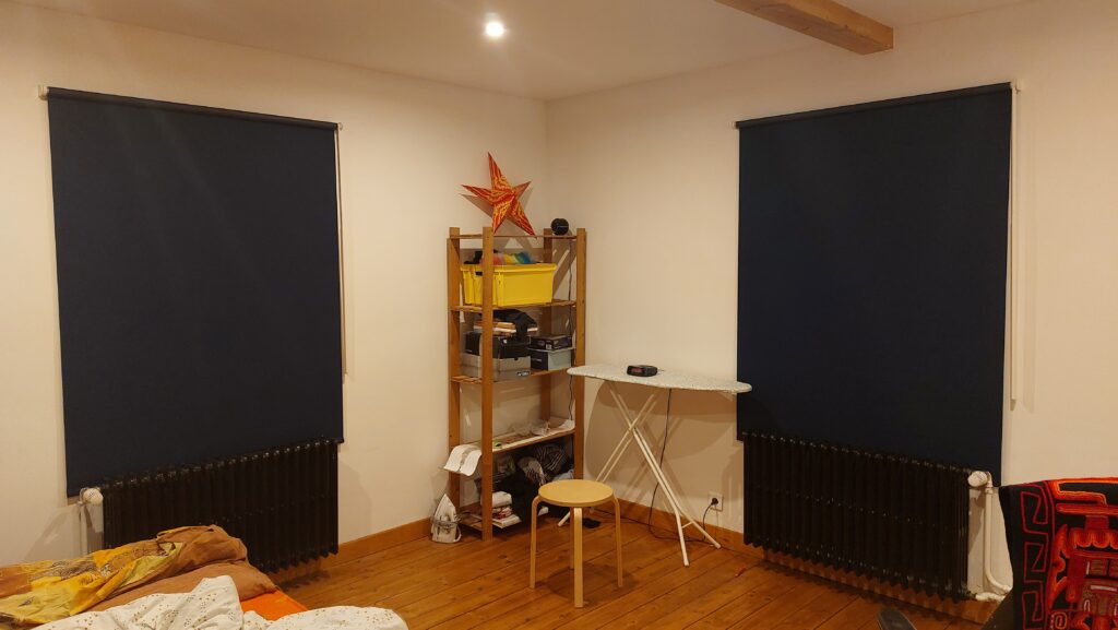 Mise en place des rideaux dans la chambre montagne achetées la veille. Ouverts/Fermés