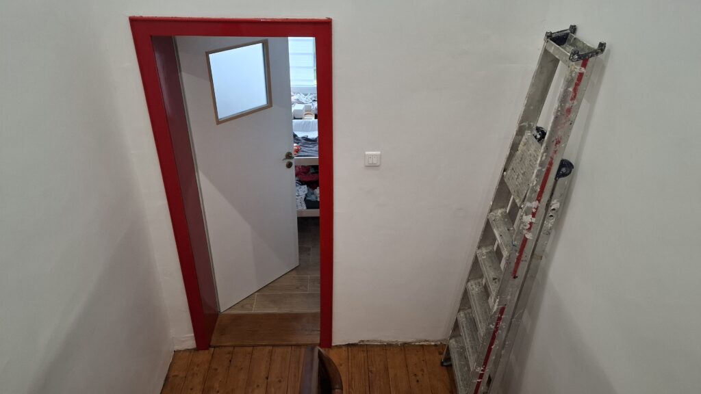 Deuxième couche de peinture sur l’huisserie de la salle de bain.