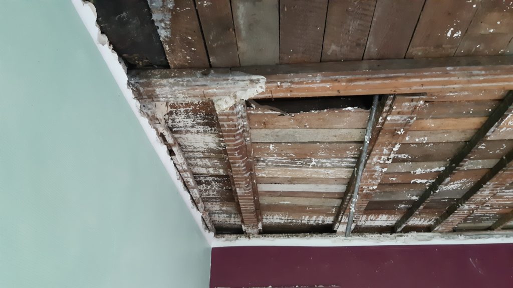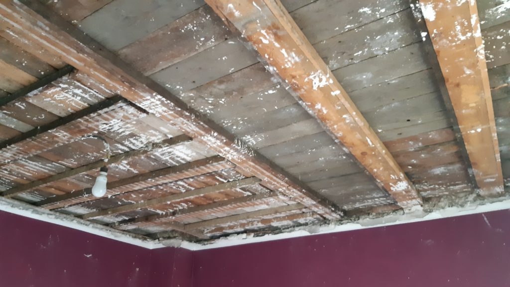 La journée commence chez Leroy Merlin avec quelques achats nécessaire pour le week-end. Ensuite, rendez-vous avec Pierre pour descendre un plafond en plus. Tout comme le plafond de la chambre parentale, celui de la chambre du 1er étage nord-ouest était également en paille. Démontage de tout le plafond et évacuation des déchets.