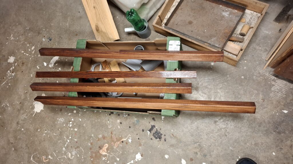 Première couche de vitrificateur sur les baguettes de finition