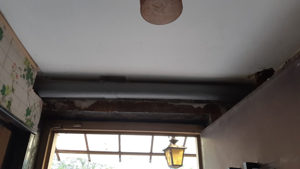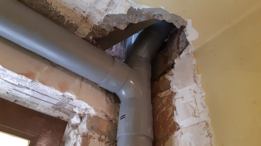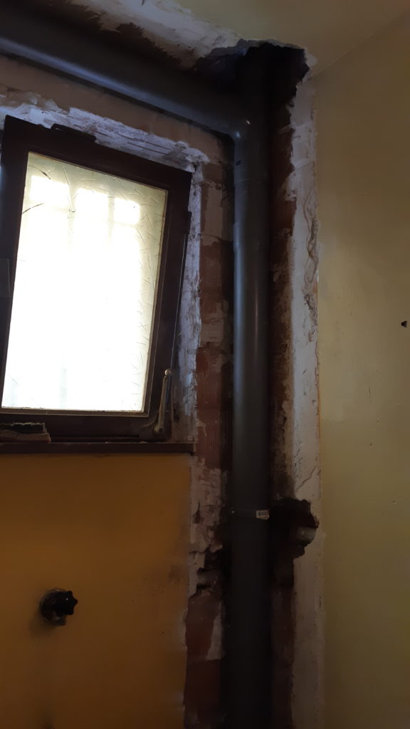 Le tube PVX D100 qui traverse verticalement le WC du RDC