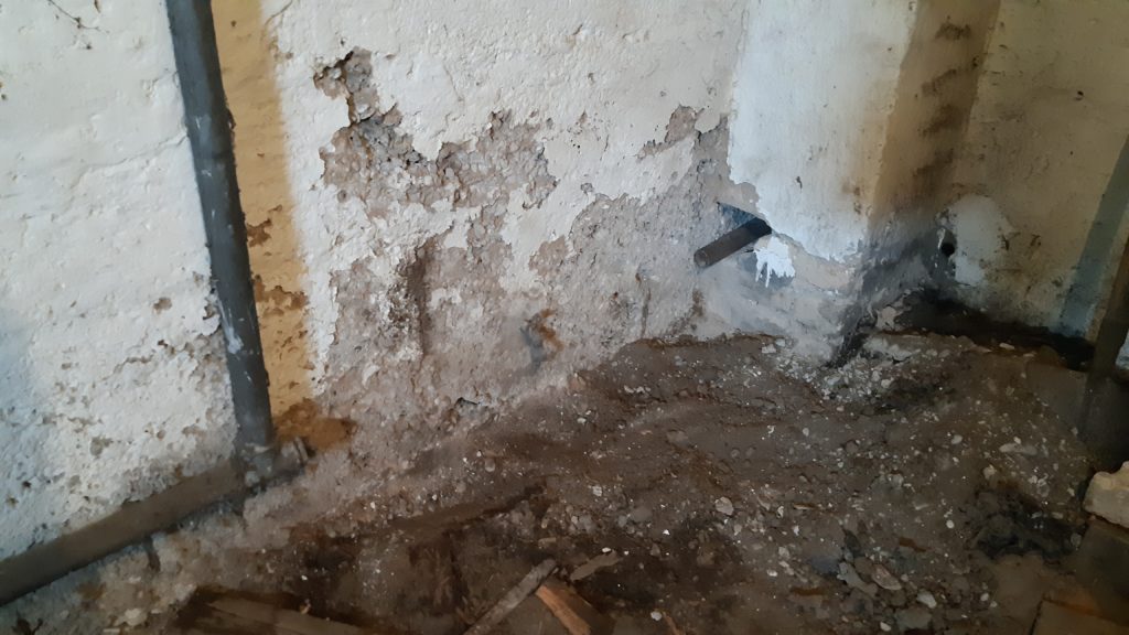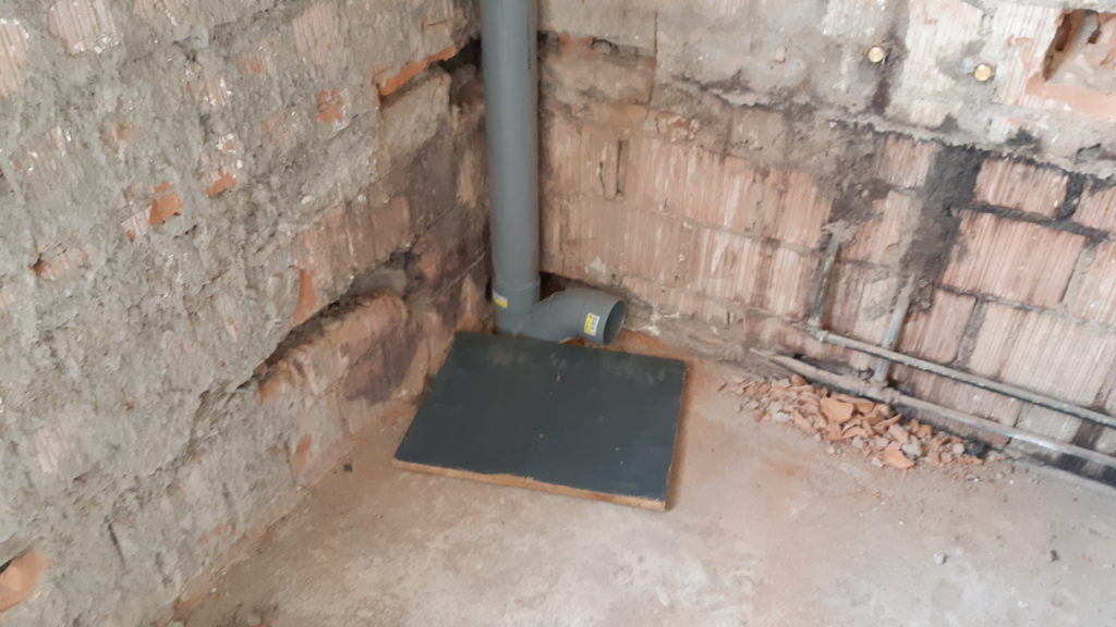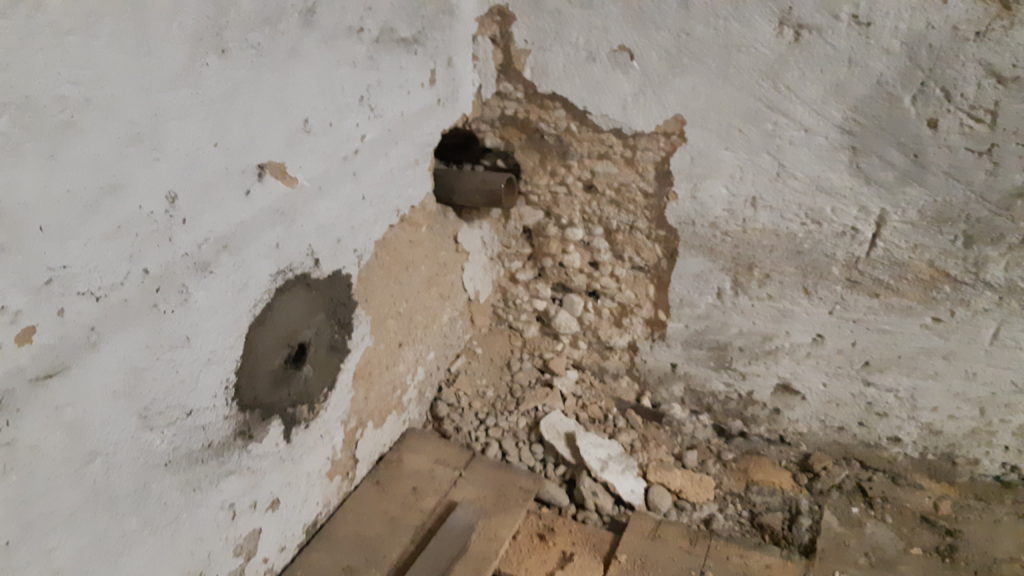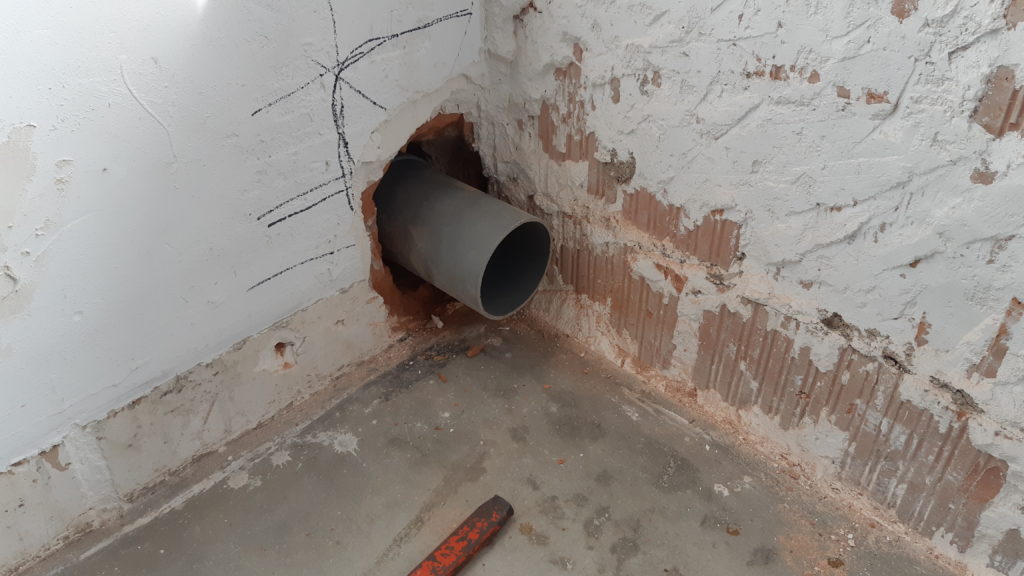 On continue avec la préparation du sous-sol pour passer les tubes PER du réseau d’eau froide. On prépare le passage de tube dans la base de la cheminée (partie plaine)