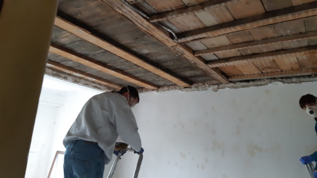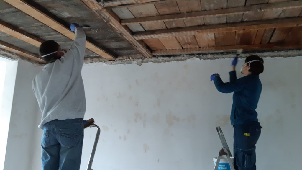 Arrivée de Mika qui vient nous prêter main forte pour gratter en déposer le Xylophène au plafond de la chambre parentale. Le temps pour moi de finir mon trou pour passer les gaines électriques entre le sas sous-sol et le local chaudières. Ensuite, installation d’une nourrice mais quelques incompatibilités. Echange à faire. Finalement j’installe un tube néon dans le local chaudière car on ne voit jamais bien dans cette pièce.