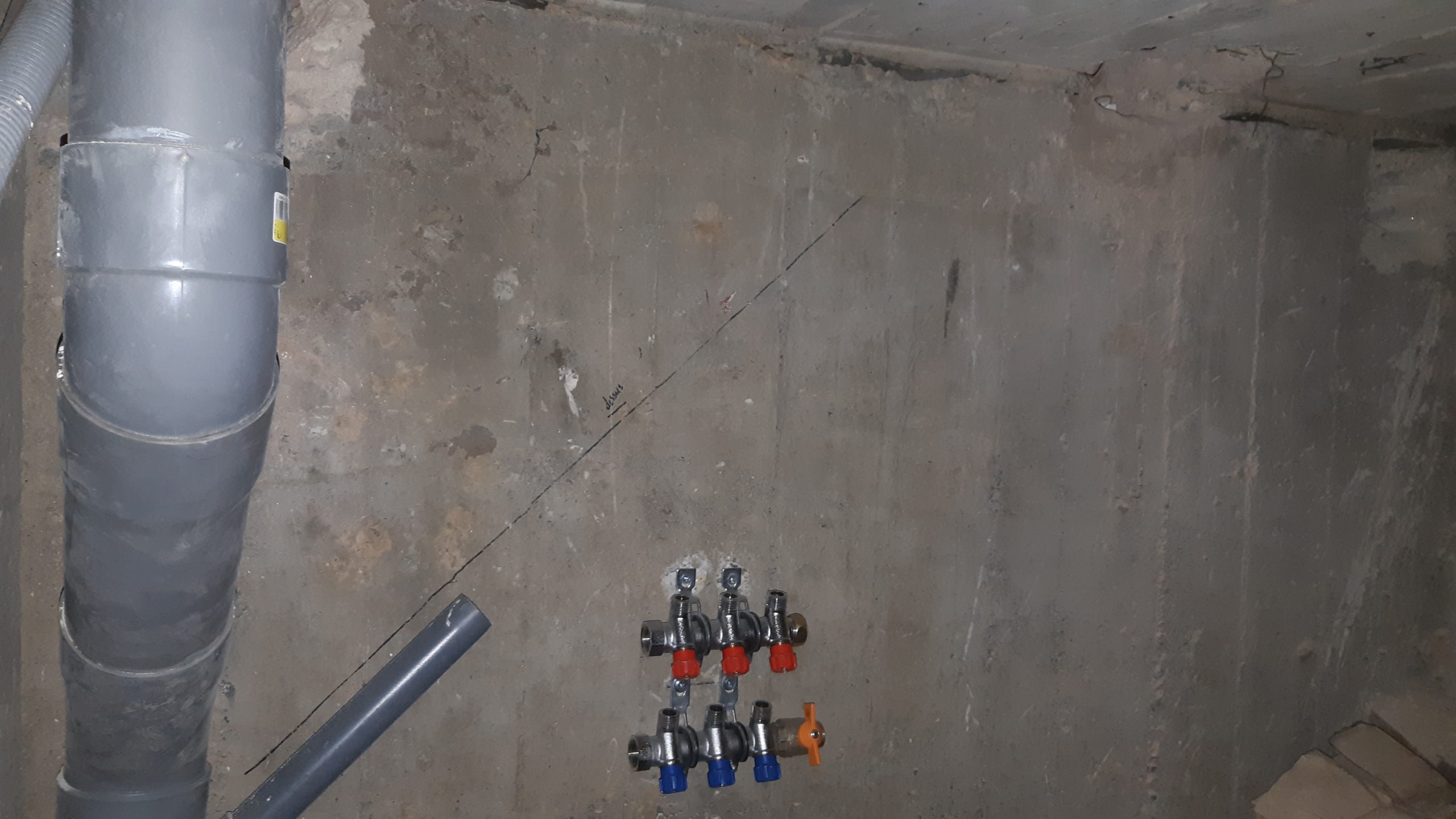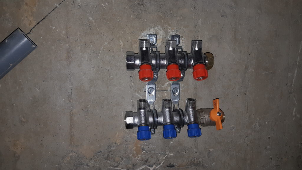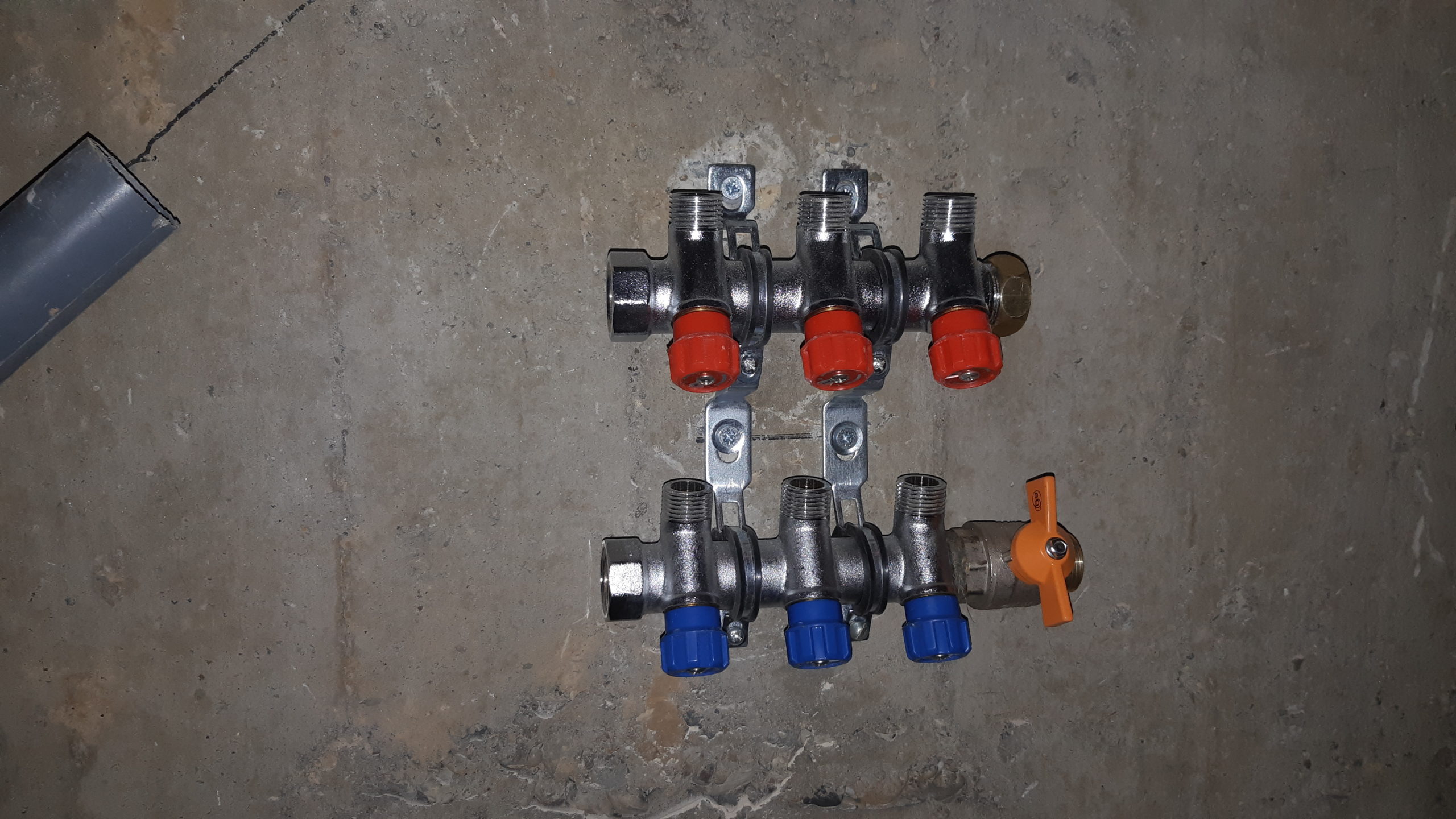 - Installation d’une paire de nourrices PER dans le local chaudière, sous le WC pour alimenter WC, lavabo et évier du sous-sol