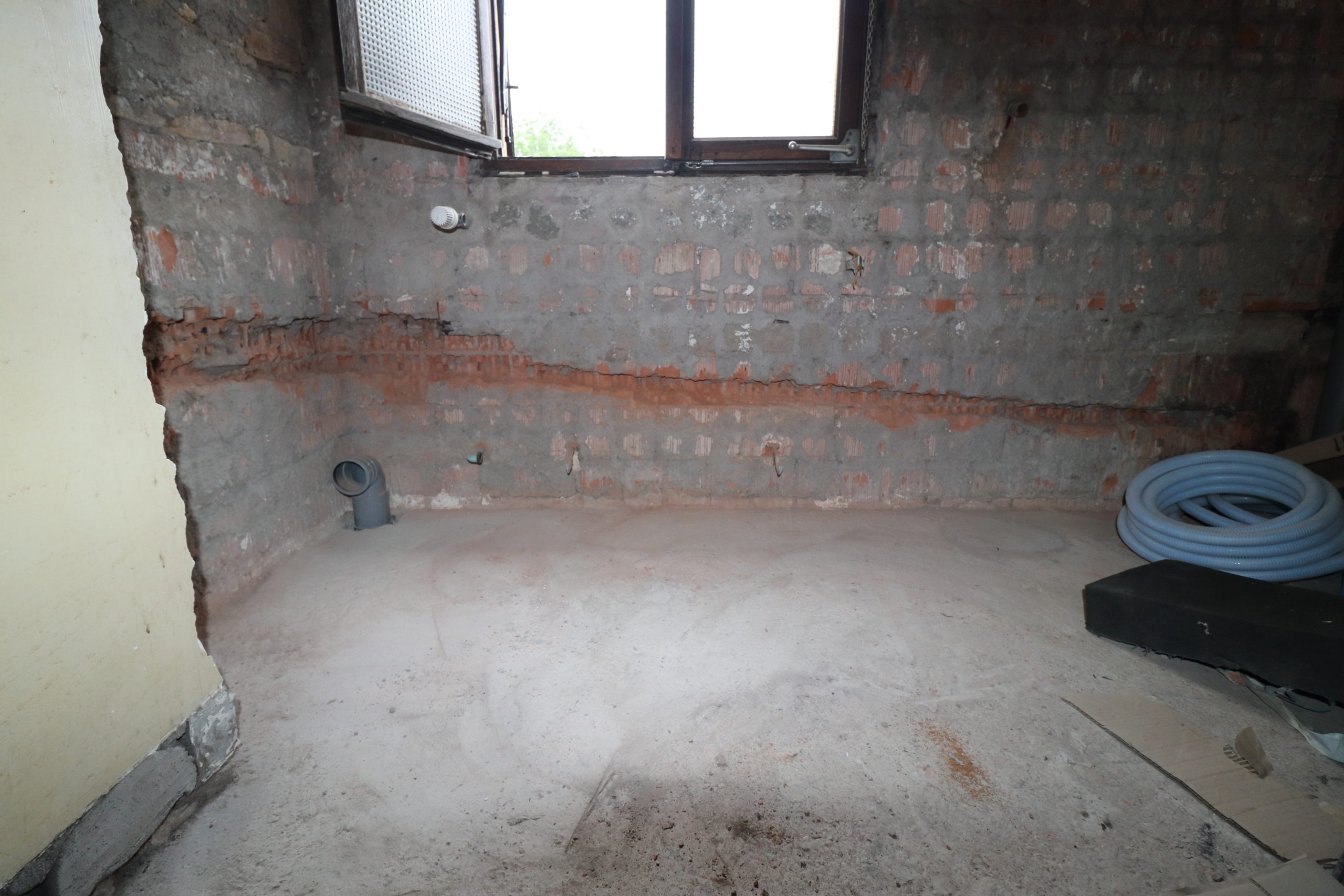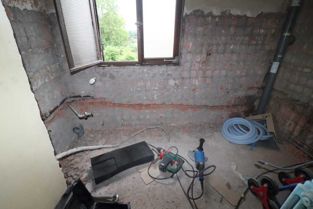 - Démolition des conduites inutilisées dans la salle de bain. Le passage sera réutilisé pour l’arrivée d’eau des WC