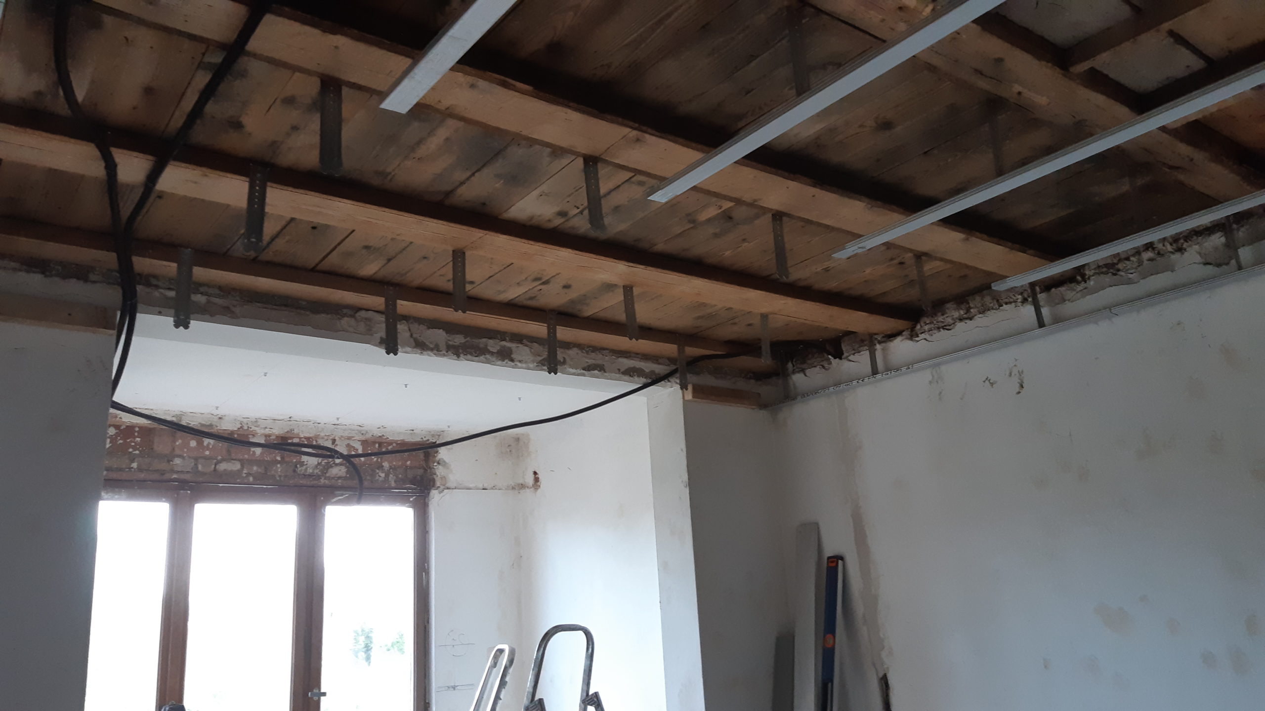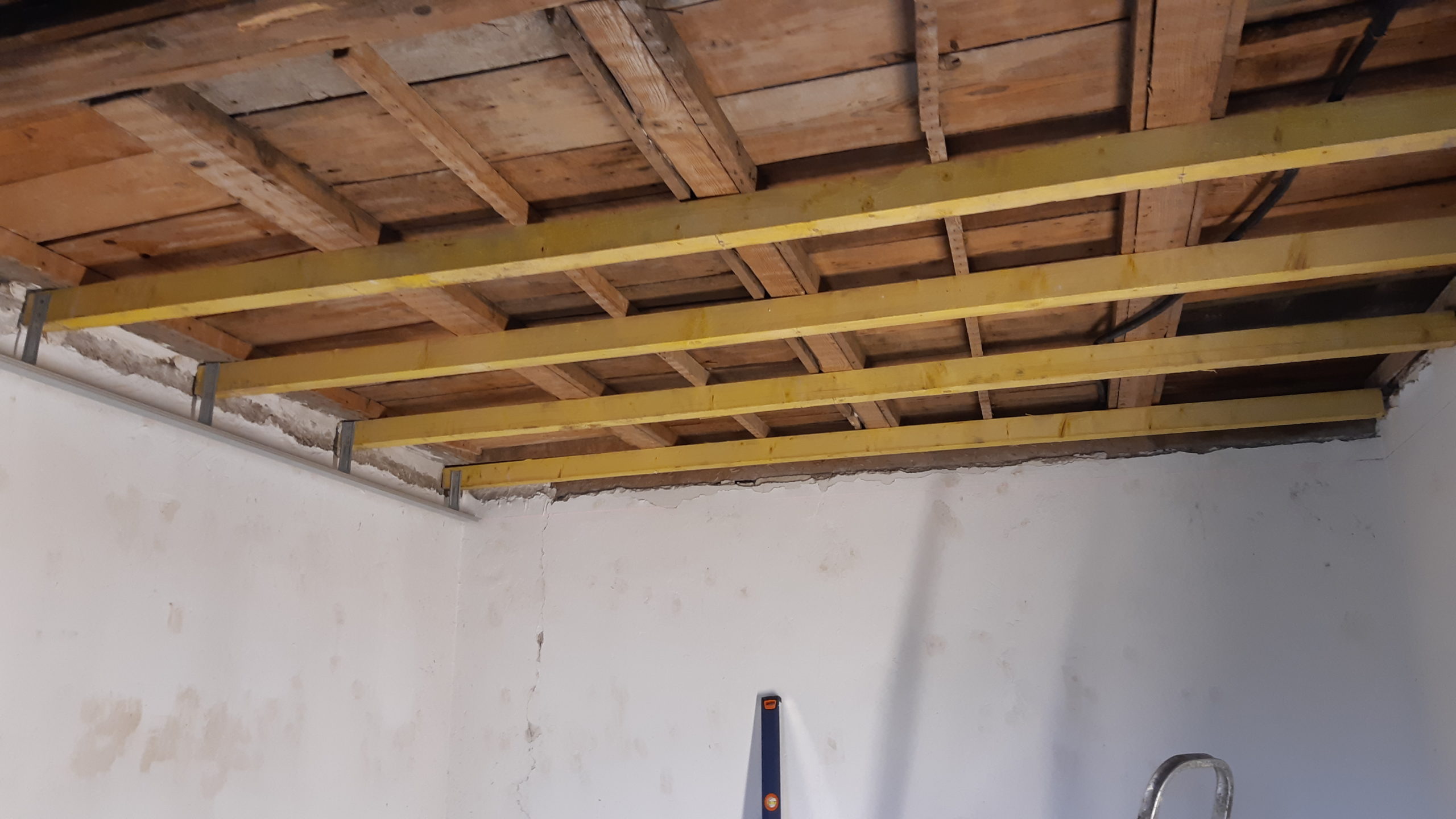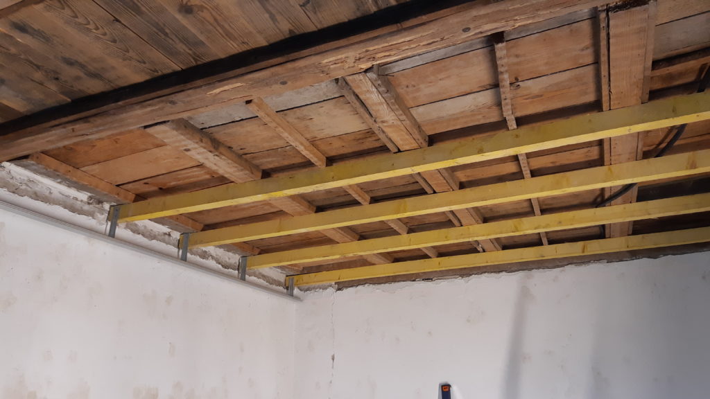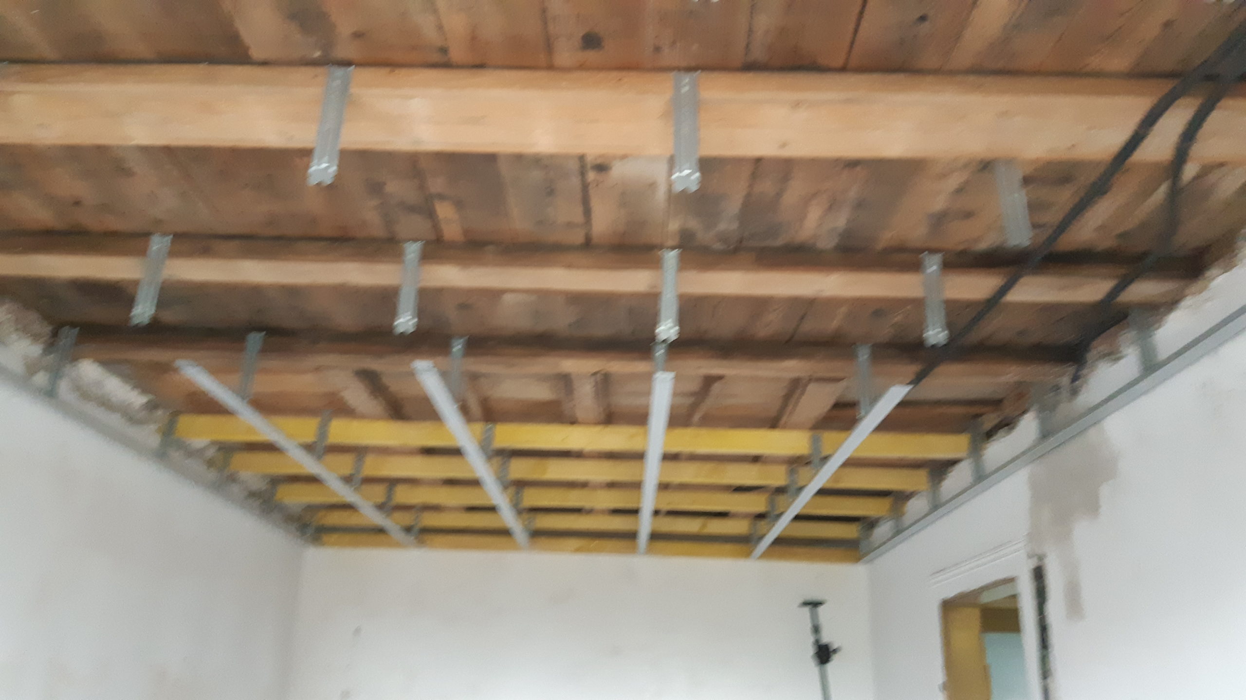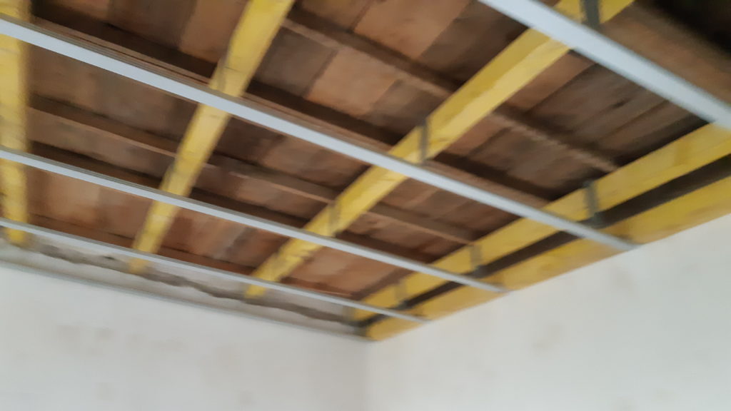 Préparation des suspentes et des rails à placo pour réaliser la plafond de la chambre
